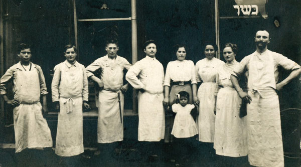 Samuel Falk, Stewart Flörsheims Großvater mütterlicherseits, führte eine koschere Metzgerei in Frankfurt am Main. Auf dem Foto sieht man ihn außen rechts, links neben ihm Familienangehörige und Angestellte.
